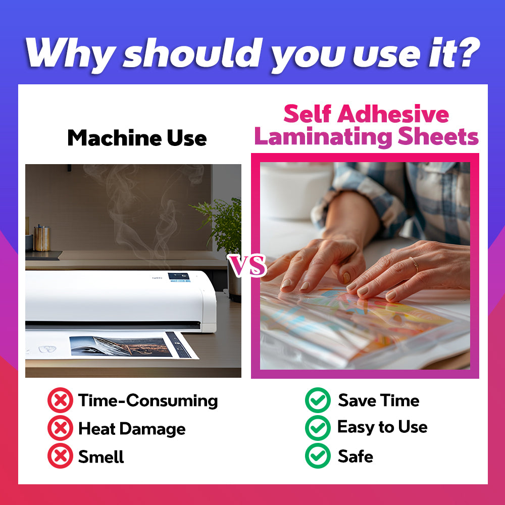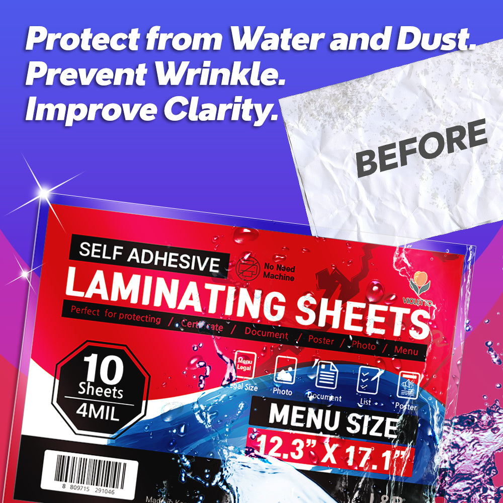 - Heat is needless for VIOLETTO Self-Adhesive Laminating Sheets. Anybody can operate the safe, handy, and immediate laminating process in any place.